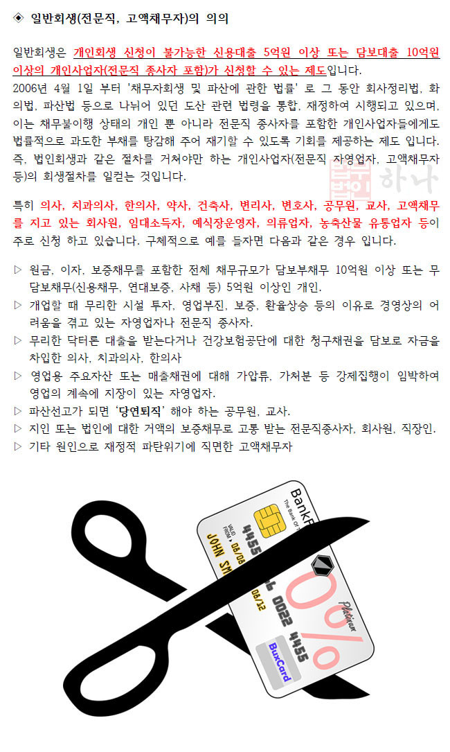 일반회생은 개인회생 신청이 불가능한 신용대출 5억원 이상 또는 담보대출 10억원 이상의 개인사업자(전문직 종사자 포함)가 신청할 수 있는 제도입니다.