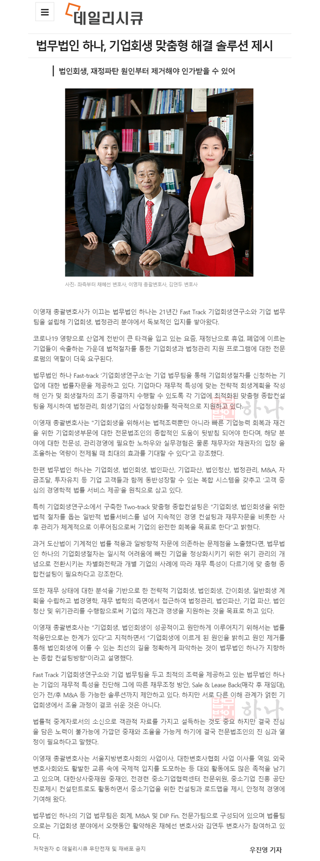 | 법인회생파산 전문 법무법인 하나 이영재 총괄변호사, 기업회생 맞춤형 해결 솔루션 제시...원인부터 제거해야 (0) | 2020.07.30 |
