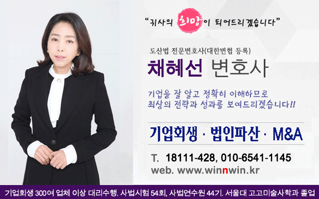 | 로펌 윈앤윈 채혜선 변호사, "기업회생은 민사소송과 달라…기업가 마음이나 상황 등 이해 필요" (0) | 2023.11.04 |