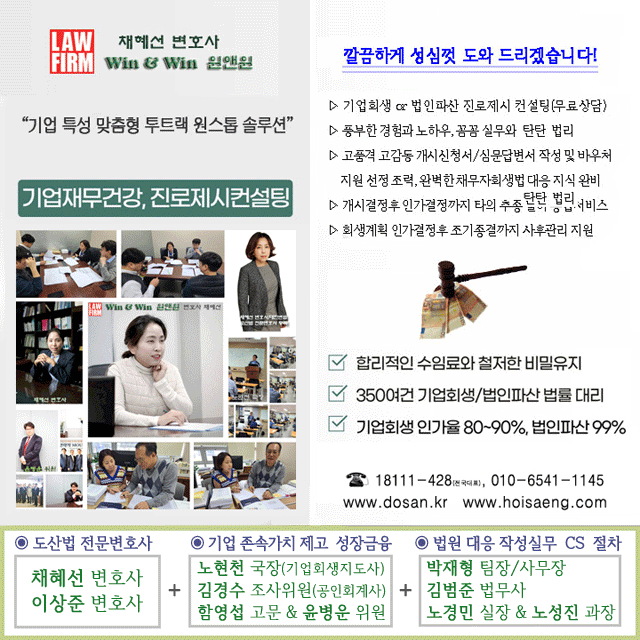 | 로펌 윈앤윈 채혜선 변호사, "기업회생은 민사소송과 달라…기업가 마음이나 상황 등 이해 필요" (0) | 2023.11.04 |